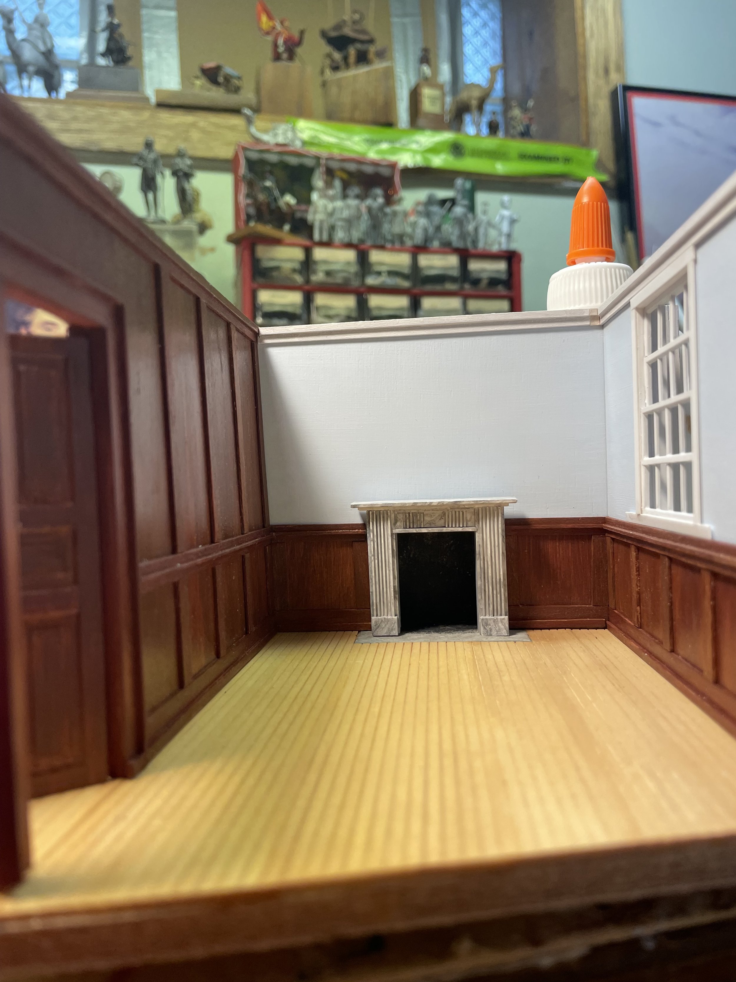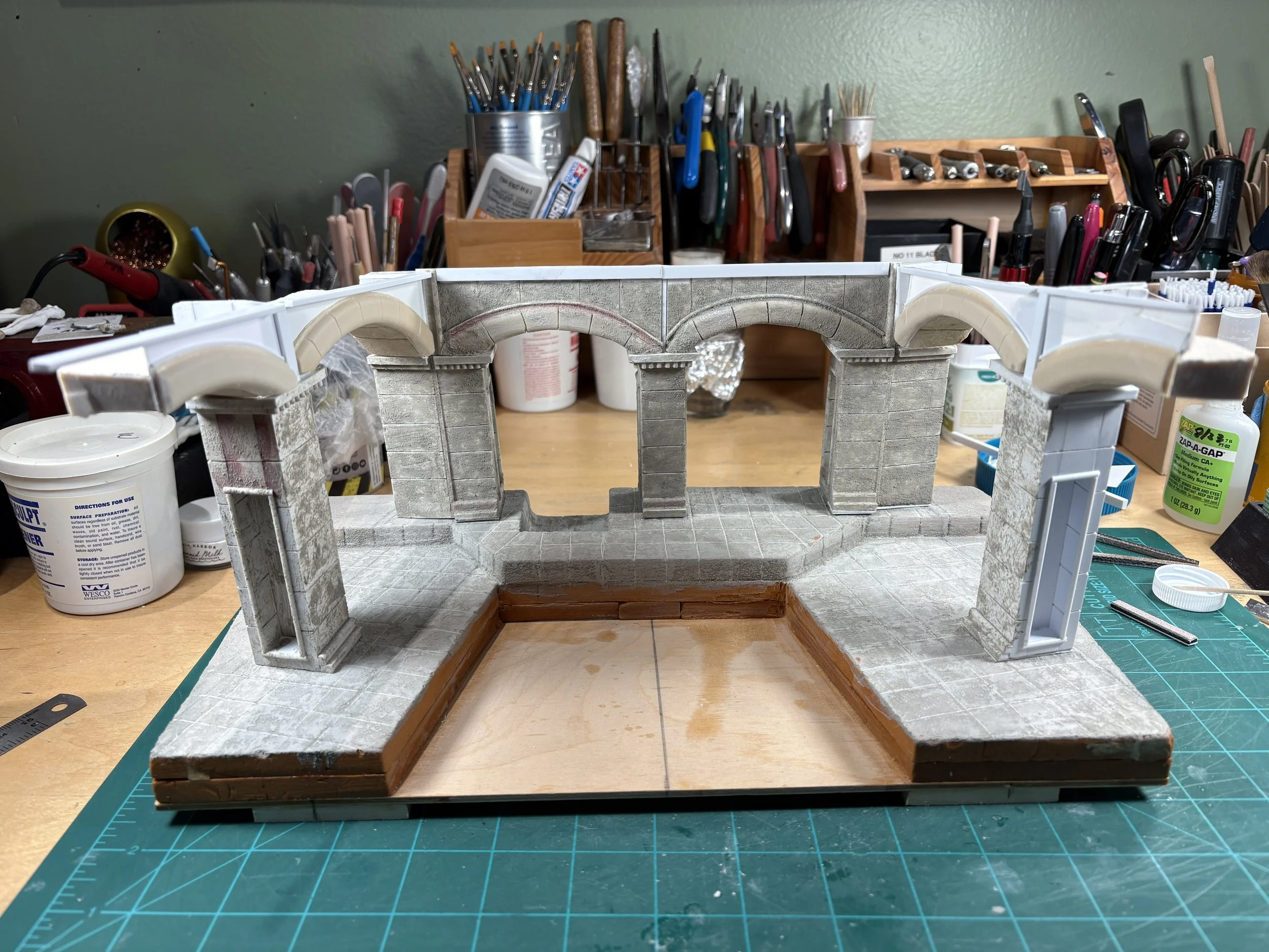 Below is some of the scenery for Jim’s box diorama in progress (and the AK Product he used to make the plastic pillars and arches look like stone), and the setting coming together for the box that their pal Joe Berton is working on.
